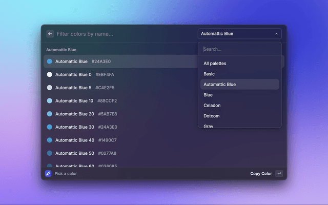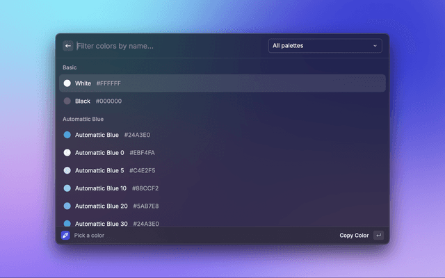 Helps you identify and pick colors from Automattic's Color Studio