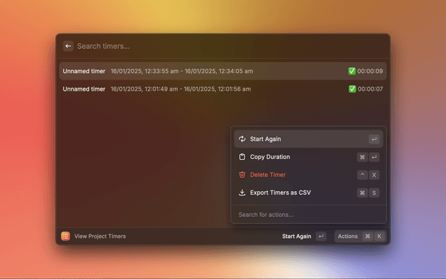 • You can export timers as CSV by selecting the "Export Timers as CSV" Action in the "View Project Times" view.