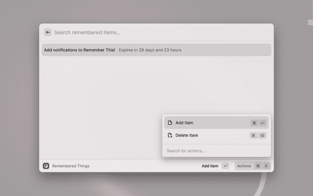 You can also view Remembered Items by typing Remembered Things in the Raycast bar. From here, you can view items being remembered, their expirey and also delete them using ⌘+delete!