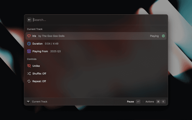 • When the Raycast menu is open, you can use Q (Previous), W (Play/Pause), E (Next), R (Like), T (Shuffle), Y (Repeat) for quick controls.