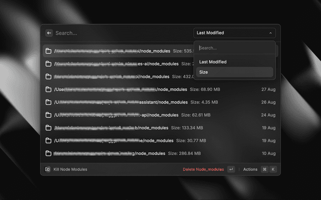List node_modules folders sorted by last modified date List node_modules folders sorted by size Confirmation dialog before deleting a node_modules folder