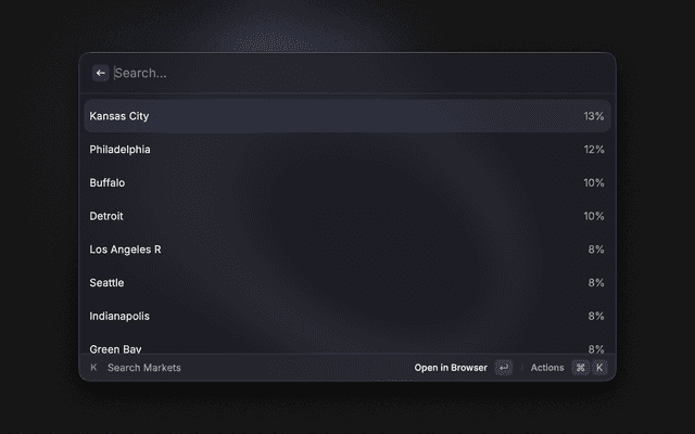 A Raycast extension for searching, browsing, and managing prediction markets on Kalshi. Quickly access trending markets, search for specific events, and keep track of your favorite markets without leaving Raycast.
