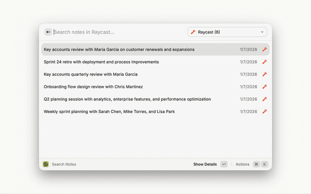 • Raycast must have access to your ~/Library/Application Support/Granola folder (macOS) or %APPDATA%\Granola folder (Windows)