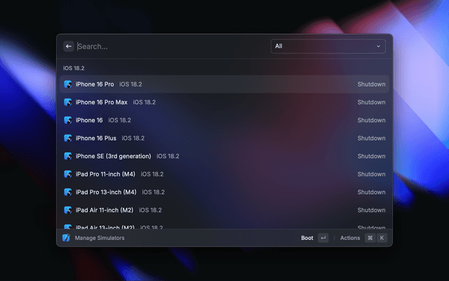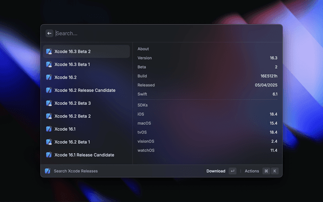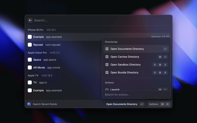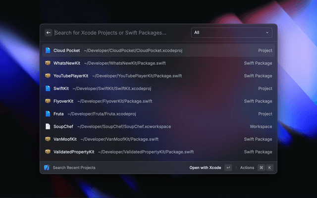 Search and open your recent Xcode Projects, manage your Simulators & Apps, view the latest Releases, create Swift Packages & Playgrounds and quickly clear Xcode cache files.