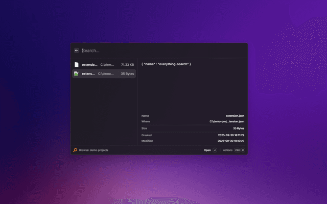 A powerful Raycast extension that integrates with Everything Search by voidtools to provide lightning-fast file system search and navigation on Windows. Transform your file discovery workflow with instant search results and comprehensive directory browsing capabilities.