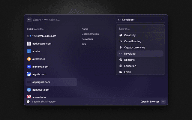 View a list of 2FA enabled sites.