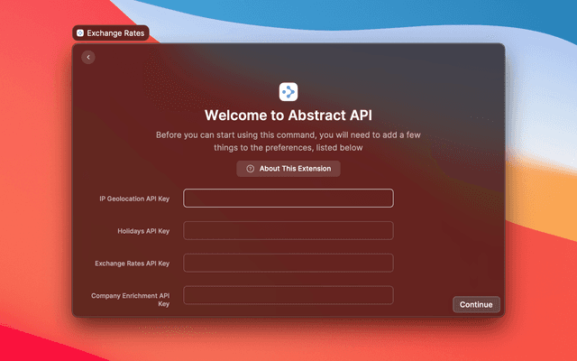 In order to make use of this extension, you'll need to enter the API key for each service you wish to use. These can be found on the Abstract API dashboard under each service.