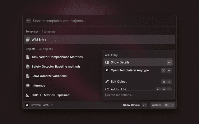 • Interact: Press Enter to view the object in Raycast or Command+Enter to open it in Anytype.