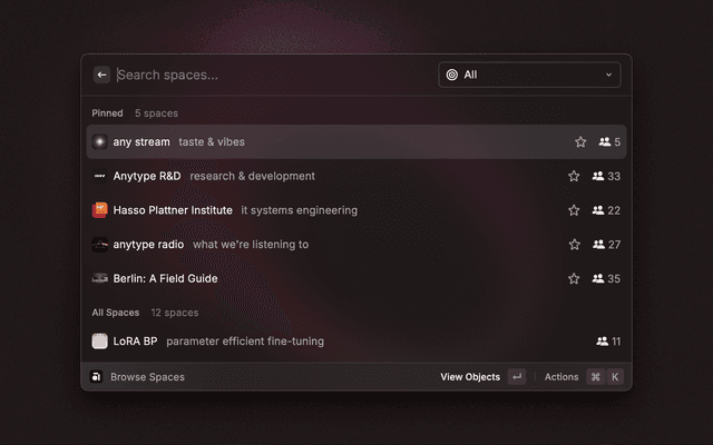 • Open: Use Command+Enter to instantly open the currently selected space or object in Anytype.