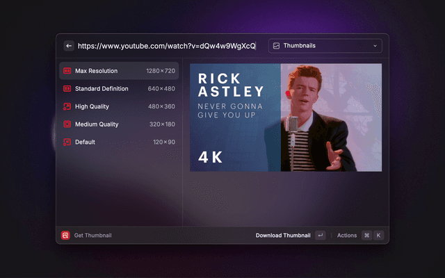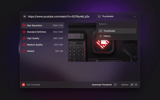 View a YouTube video's thumbnail variants, then download the images or copy their URLs.