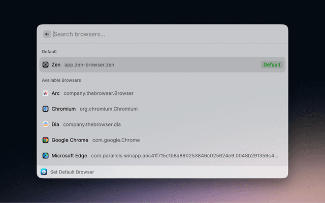 • Set Default Browser (view): Lists installed browsers alphabetically, highlights the current default, and lets you set a new one.