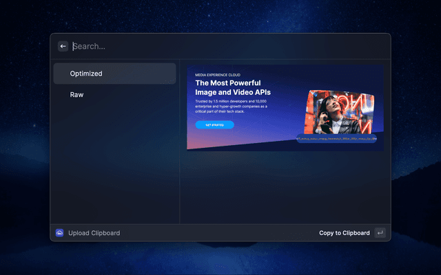 Search assets and upload your clipboard to your Cloudinary account