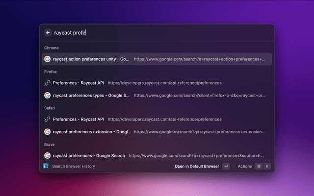 Search and open Google Chrome, Mozilla Firefox, Safari, Microsoft Edge, Brave, Vivaldi, Arc, Opera, Iridium, Orion and Sidekick tabs from search query based on browser history from all browsers.