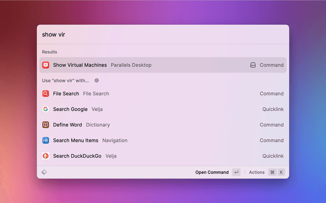 List virtual machines in Parallels Desktop. Open, start, resume, and suspend virtual machines.
