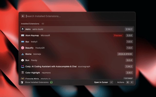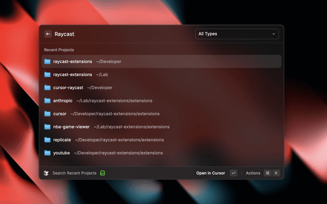 Control Cursor directly from Raycast - Search and open recent projects, handle extensions and commands.