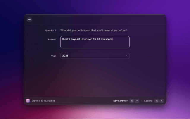 This small Raycast extension surfaces a curated set of 40 reflective questions intended for an end-of-year review. It provides two commands (see package.json):