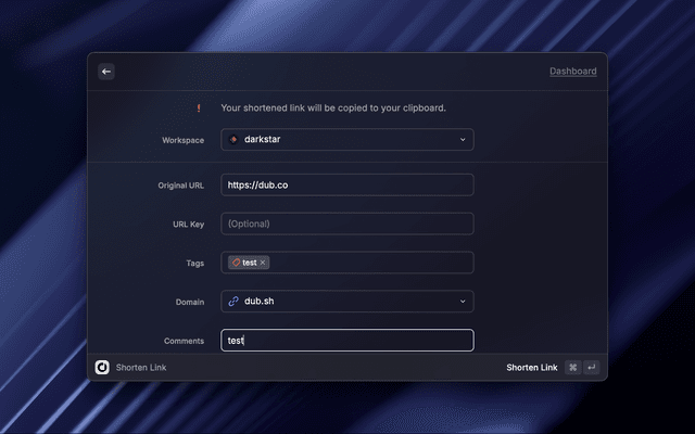 Dub is the open-source link management platform for modern marketing teams. This extension allows you to shorten and retrieve your Dub links directly inside Raycast.