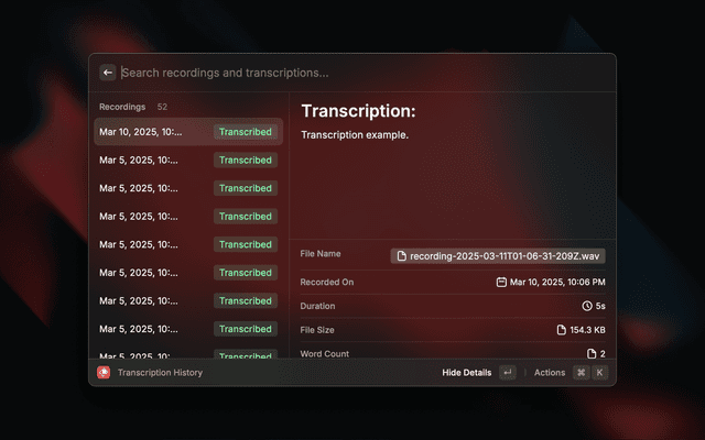 Audio recordings are stored locally in a dedicated directory managed by Raycast. You can manage or delete these recordings through the Transcription History feature.