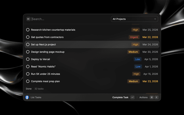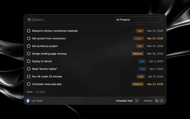 • List Tasks — Browse tasks by project with smart due date indicators and priority tags