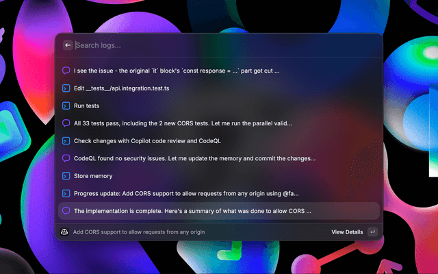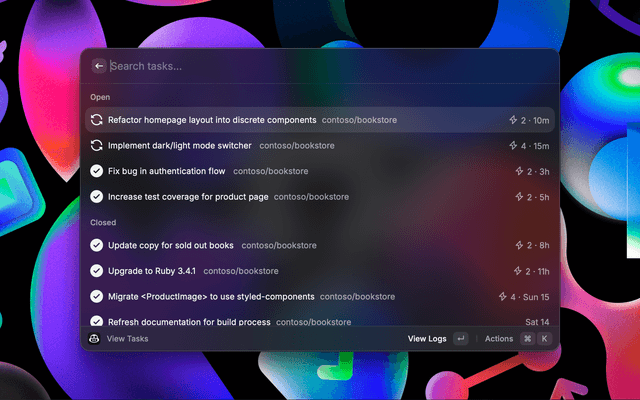 • View Tasks: Track the progress of tasks you've given to Copilot, with access to live agent logs. Available as a Raycast command, and from the menu bar.