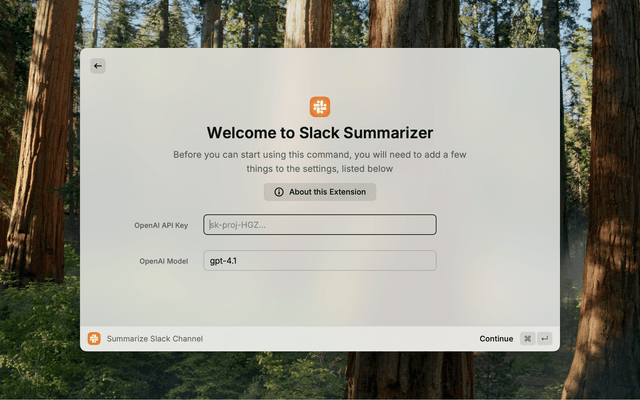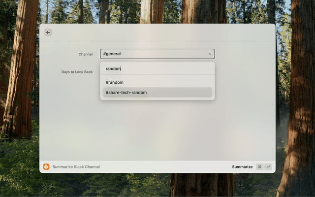 Open Raycast → ExtensionsSlack Summarizer and set: