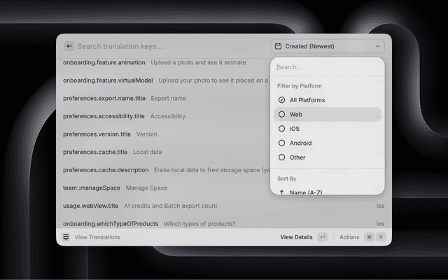 • View Translations: Browse and search all translation keys in your Lokalise project