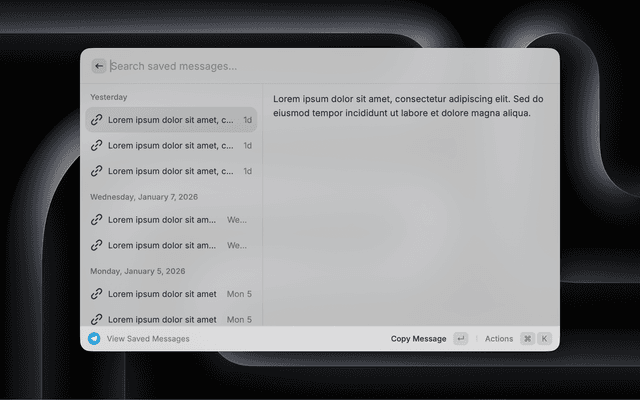 - π₯ View Saved Messages: Browse your Telegram saved messages directly in Raycast