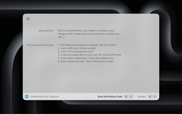 - Run the "Authenticate with Telegram" command in Raycast
