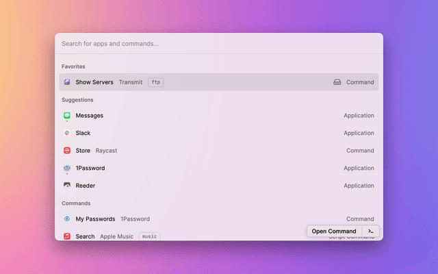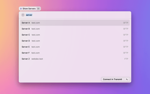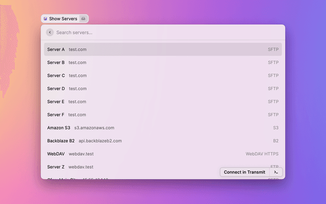 Displays a list of servers bookmarked in Transmit for quick connecting.