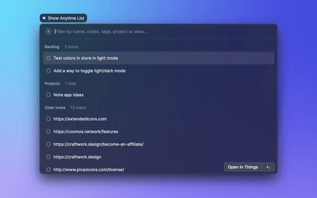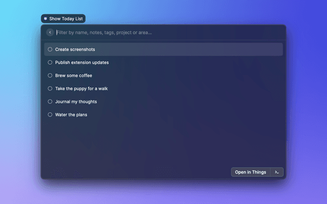 If you don't see any of your to-dos in any commands, please make sure Things is installed and running before using this extension. If Things is running, you may need to grant Raycast access to Things in System Settings > Privacy & Security > Automation > Raycast > Things.