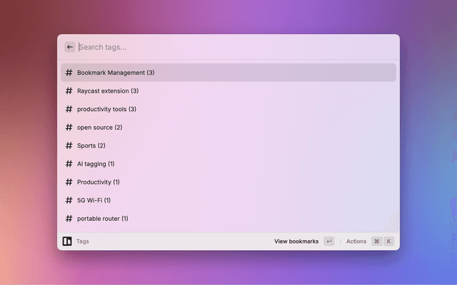 • Fast Bookmark Creation: Create new bookmarks directly from Raycast with just a few keystrokes