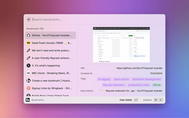 A user-friendly Raycast extension that seamlessly integrates with Karakeep (previously Hoarder), bringing powerful bookmark management to your fingertips. Quickly save, search, and organize your bookmarks, texts, and images—all through Raycast's intuitive interface.