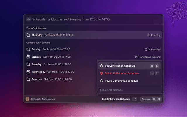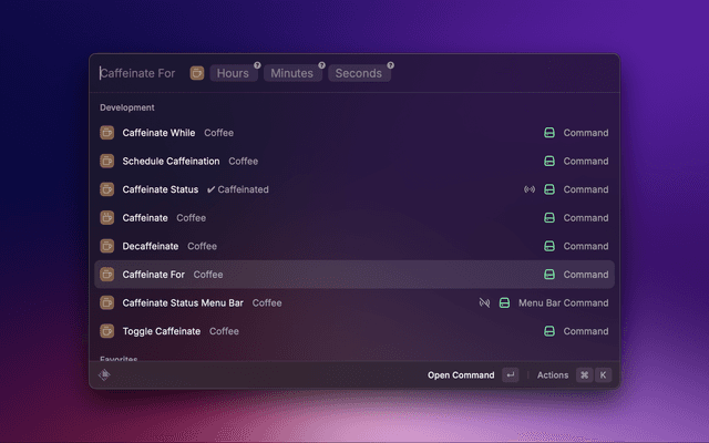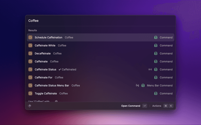 Once installed, simply trigger the Raycast command palette and search for the desired caffeination command.