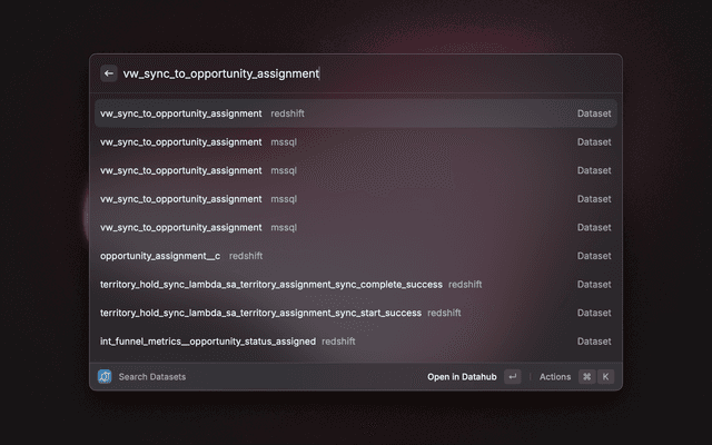 • Quick Search: Instantly search your DataHub catalog with the Search Datahub command