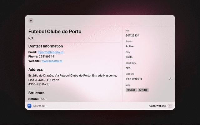 Search and verify Tax Identification Number (NIF) for Portuguese companies.