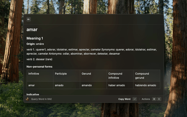 Query words in the Royal Spanish Academy dictionary directly from Raycast. Get definitions, conjugations, and expressions quickly without opening a browser. Using https://rae-api.com, unofficial API.