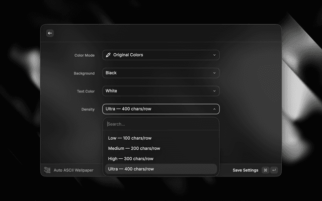 • Auto ASCII Wallpaper — Configure settings and apply a random ASCII wallpaper instantly.