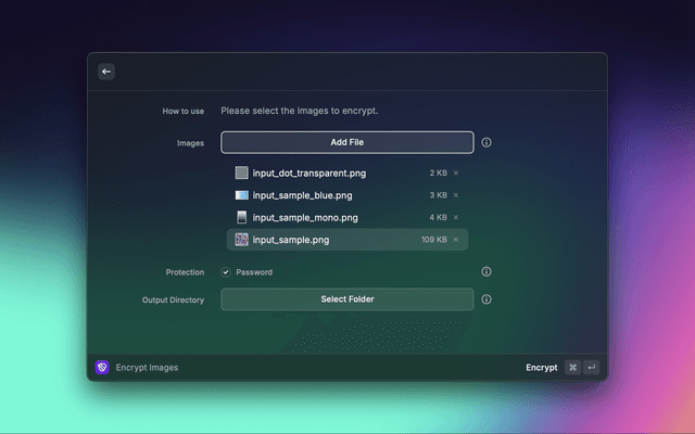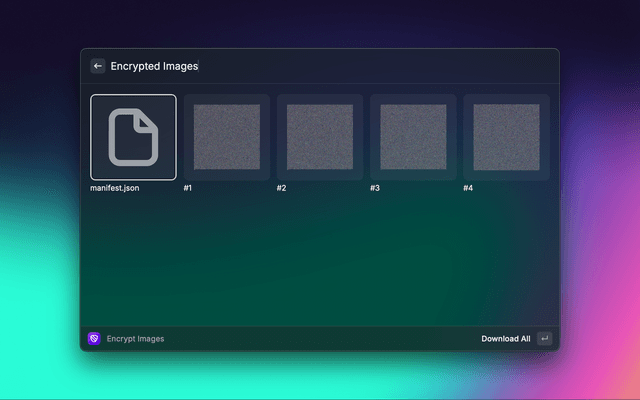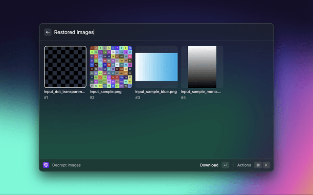 This Raycast extension provides functionality for image encryption and decryption, helping you protect confidential images by transforming them into encrypted fragments using AES-256 encryption.