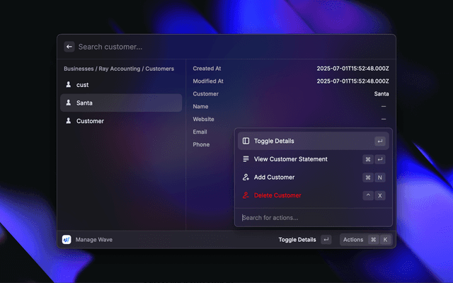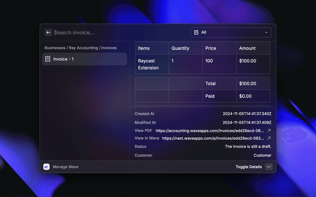 This is a Raycast extension for Wave. It allows you to view your Wave Businesses and their associated Invoices, Customers and even some Customer Statements π.